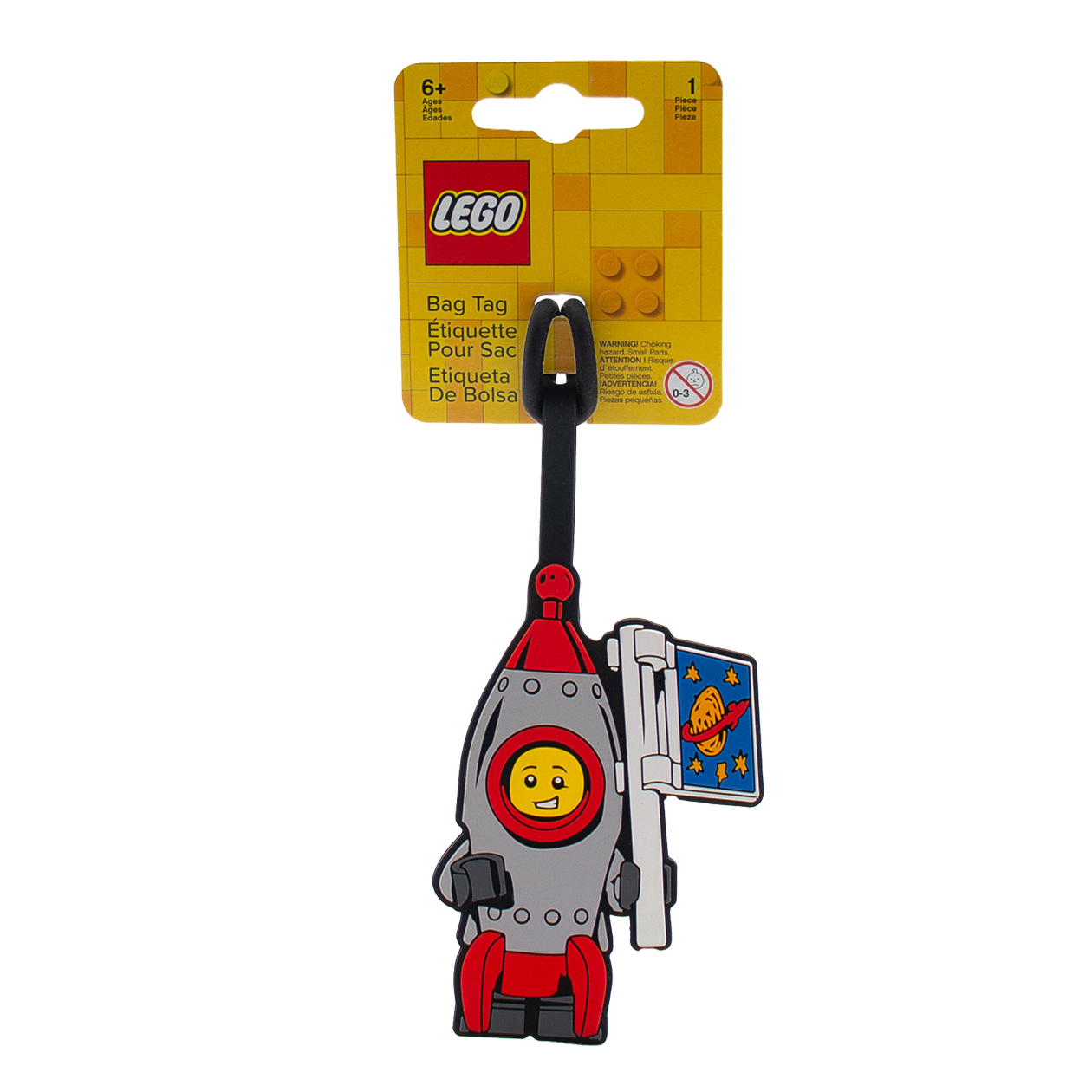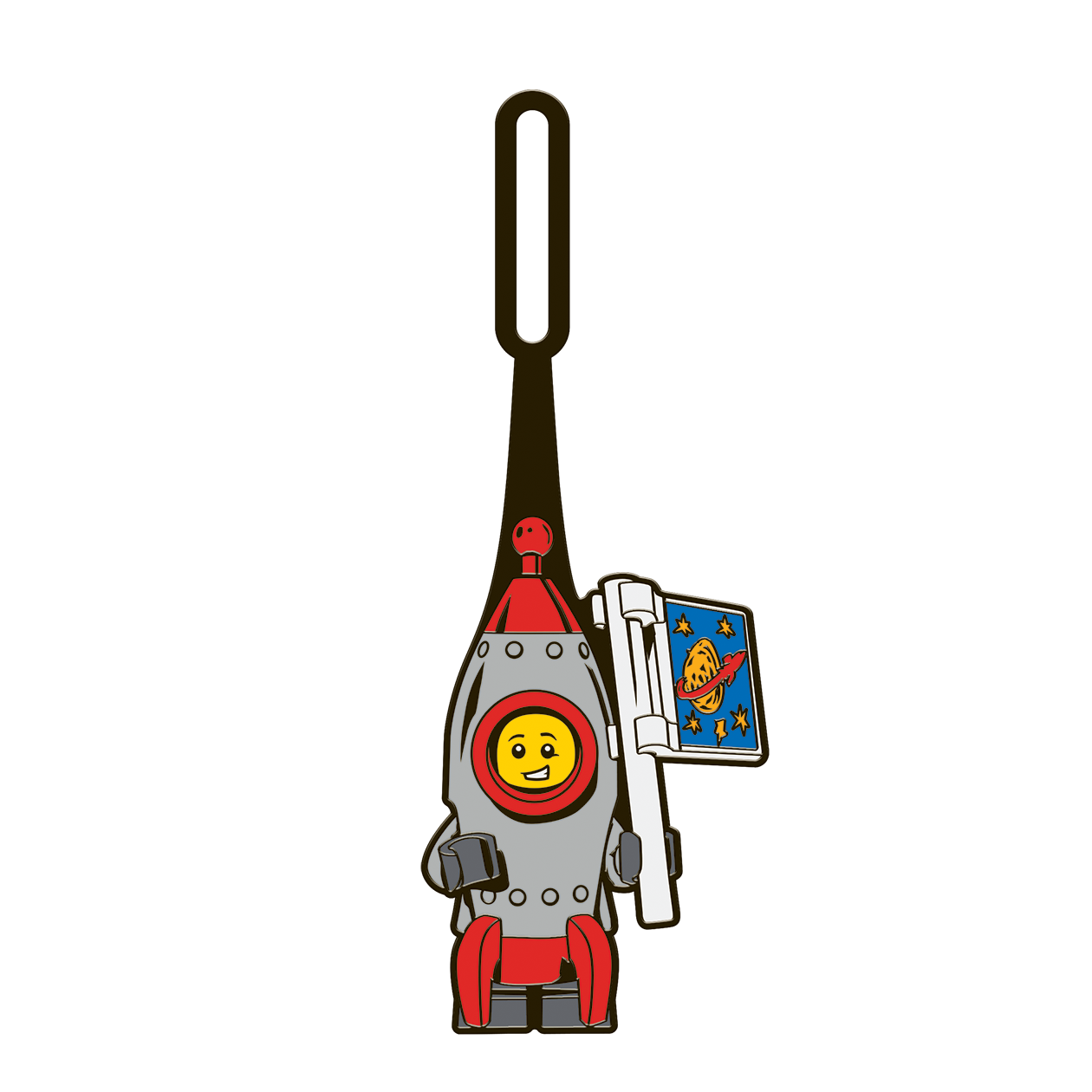 "LEGO bagage tag i LEGO Raketdreng mønster. Fleksibel silikone og nem at tilføje til både kufferter og andre rejsetasker."