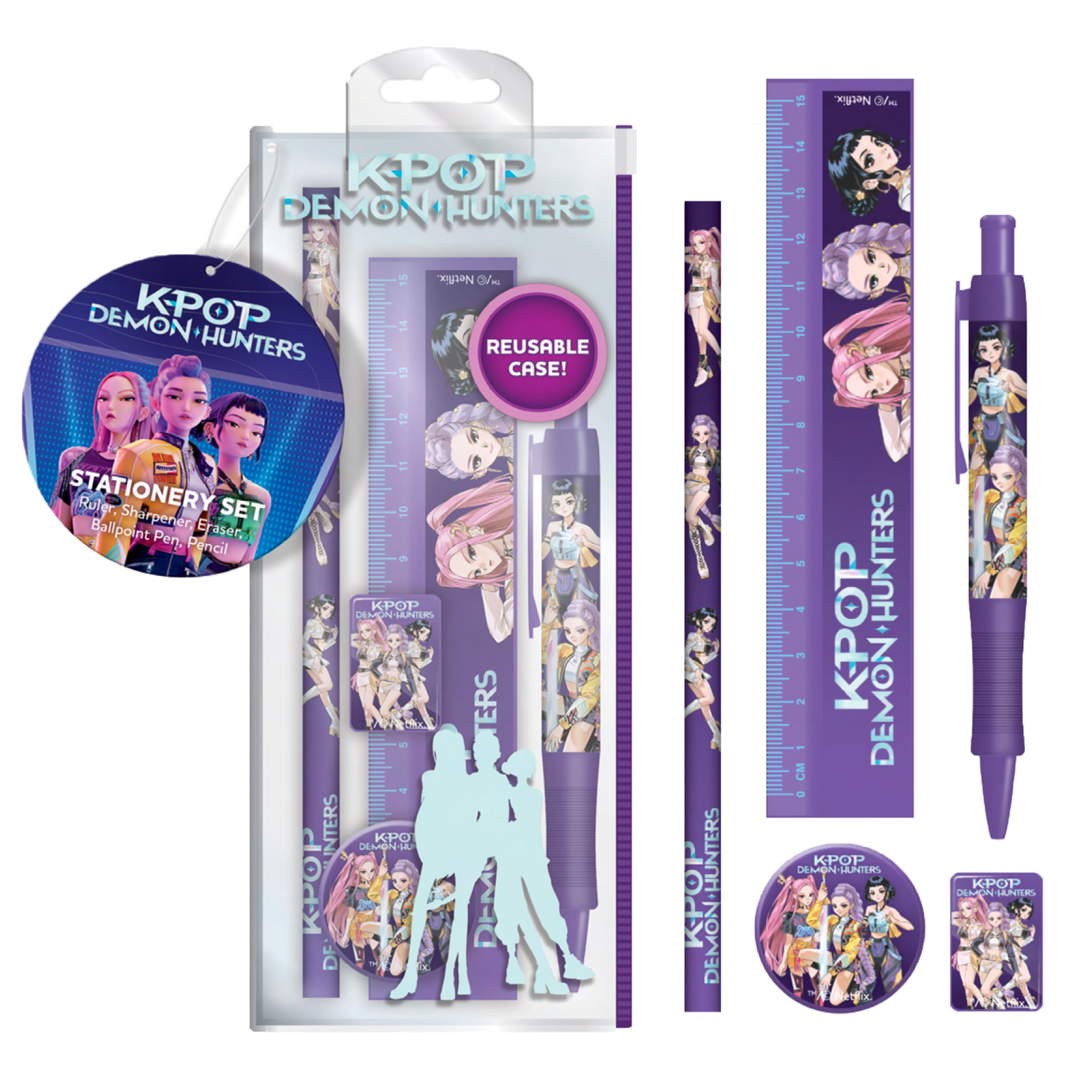 KPop Demon Hunters 5-styks skrivesæt er perfekt til fans af KPop og fantasy! Sættet inkluderer blyant, kuglepen, lineal, blyantspidser og viskelæder, alt sammen med det fantastiske demonjæger-temaer. Ideelt til at skrive, tegne og udtrykke din kreativitet.