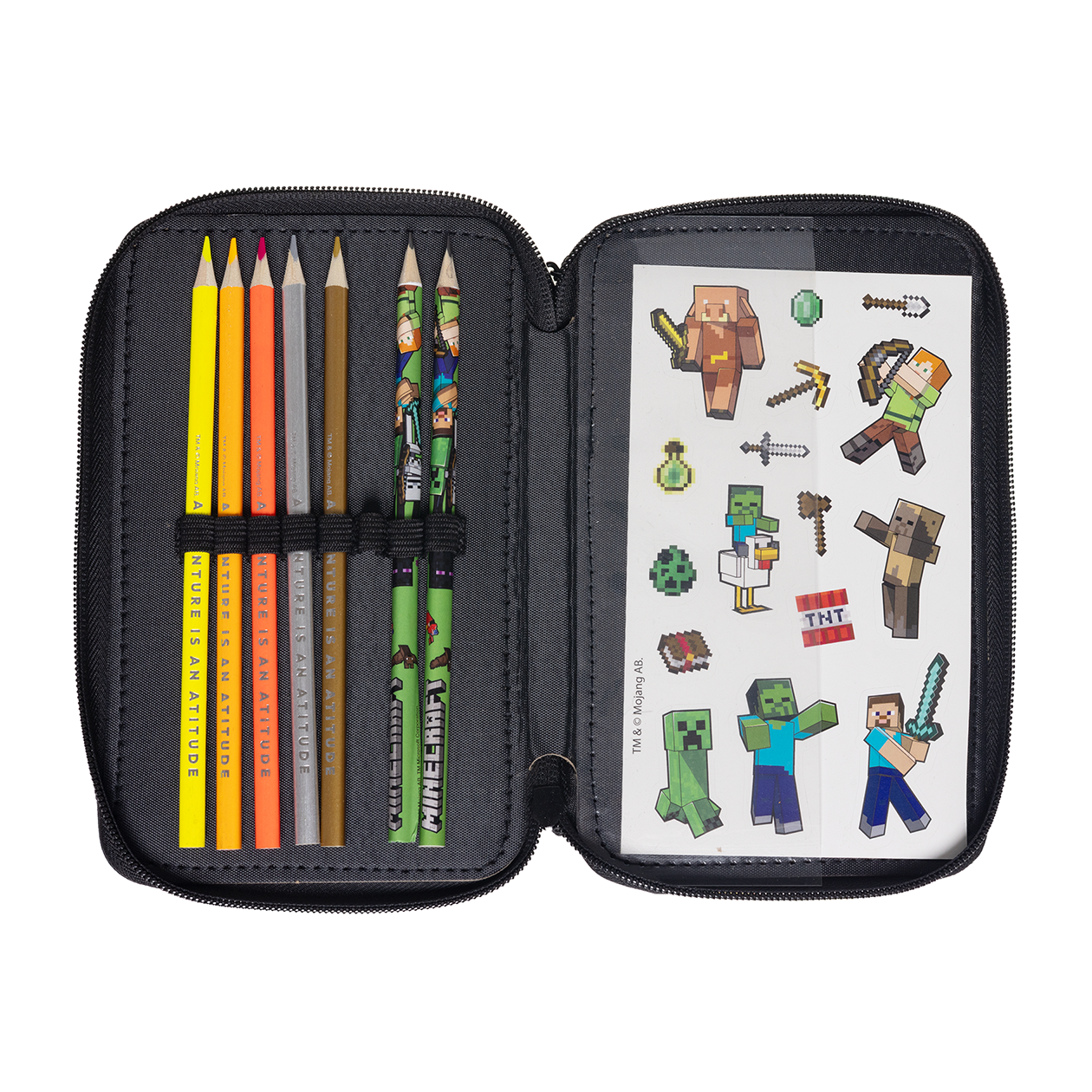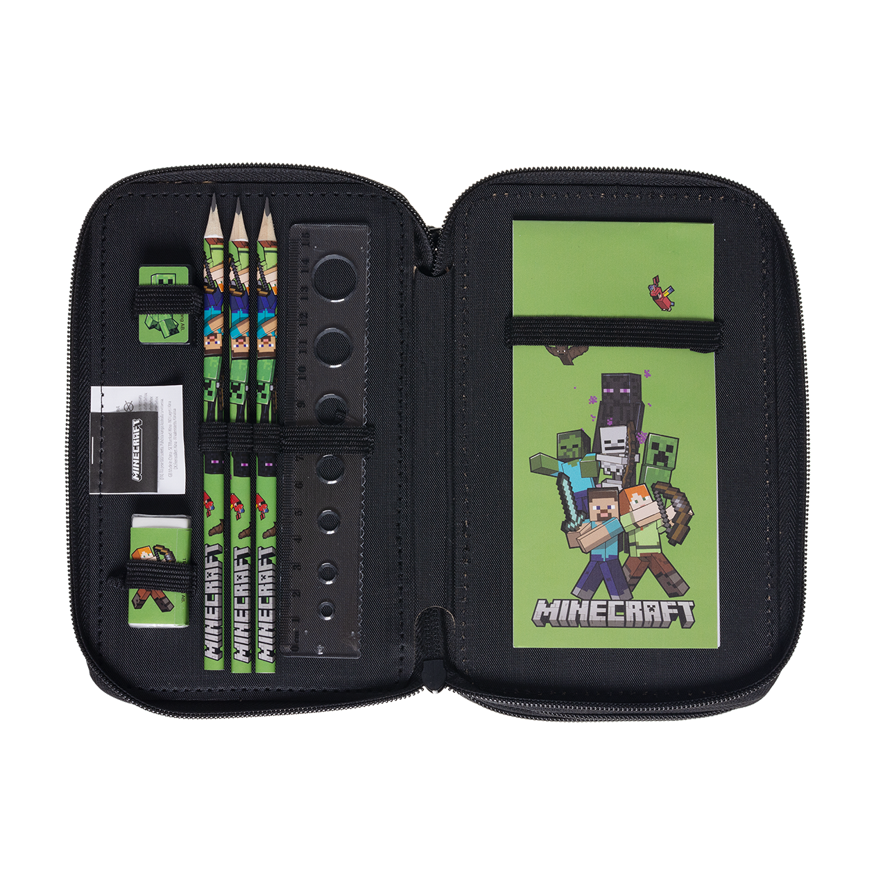 Oplev dette seje fyldte penalhus med 3 rum inspireret af Minecraft universet! Dette praktiske penalhus er perfekt til skolebrug og opbevaring af skriveredskaber. Penalhuset indeholder 5 blyanter, 16 farveblyanter, 3 neon farvede blyanter, 1 guld farveblyant og 1 sølv farveblyant, 1 viskelæder, 1 blyantspidser, 1 lineal, 1 notesblok og 1 klistermærkeark.