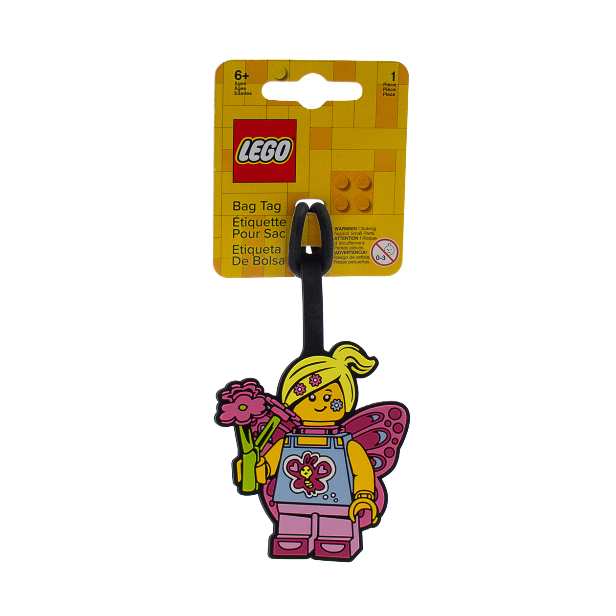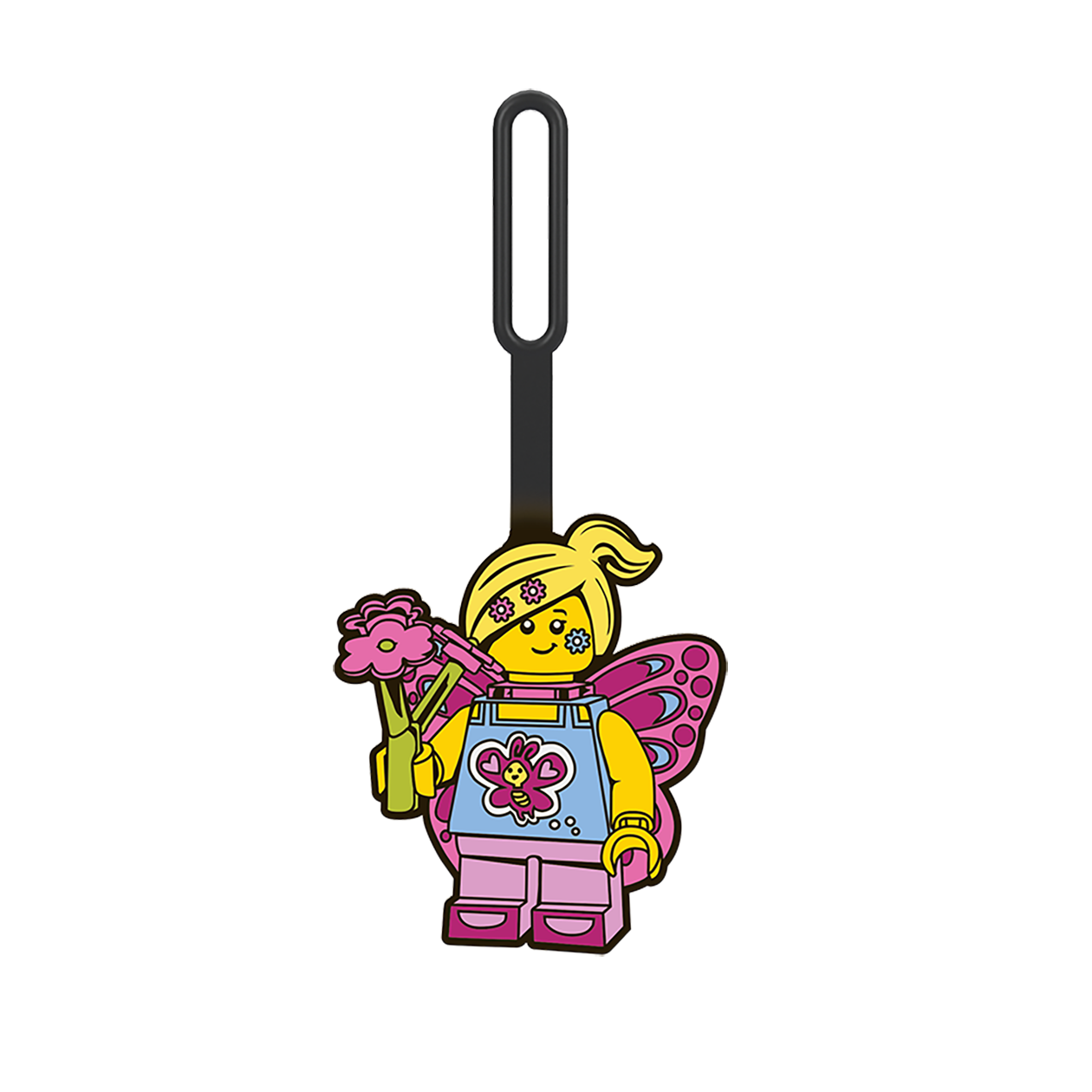 "LEGO bagage tag i LEGO Sommerfuglepige mønster. Fleksibel silikone og nem at tilføje til både kufferter og andre rejsetasker."