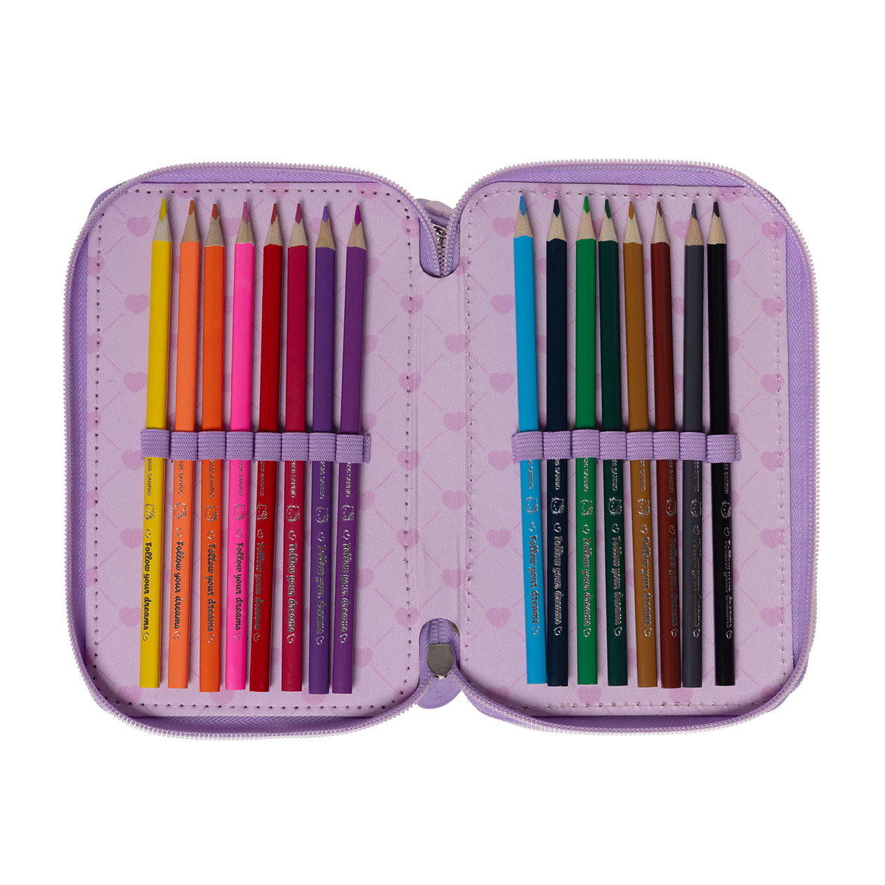 Dette søde Hello Kitty penalhus er perfekt til skolebrug! Det har tre rum, så du kan organisere dine skriveredskaber, farver og andre småting. Det farverige design med den elskede Hello Kitty gør det til et hit blandt børn. Ideelt til at holde styr på alt dit udstyr! Penalhuset indeholder 5 blyanter, 16 farveblyanter, 3 neon farvede blyanter, 1 guld farveblyant og 1 sølv farveblyant, 1 viskelæder, 1 blyantspidser, 1 lineal, 1 notesblok og 1 klistermærkeark.